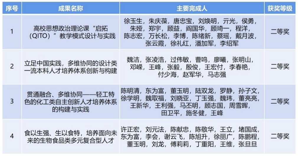 近日,教育部公布了2022年国家级教学成果奖获奖项目名单,我校作为第一完成单位喜获4项高等教育(本科)国家级教学成果奖二等奖,获奖数量位列全省第三、全国并列第十。获奖项目分别是《高校思想政治理论课“启拓(QITO)”教学模式设计与实践》《立足中国实践,多维协同的设计类一流本科人才培养体系创新与构建》《贯通融合、多维协同——轻工特色的化工类自主创新人才培养体系的构建与实践》《食以生强、生以食特,培养面向未来的生物食品类多元复合型人才》。