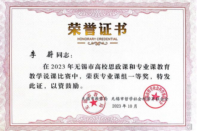 近日,无锡市教育局、无锡市哲学社会科学界联合会公布了2023年无锡市高校思政课和专业课教育教学说课比赛决赛结果,我校纺织科学与工程学院李蔚老师荣获专业课组一等奖。