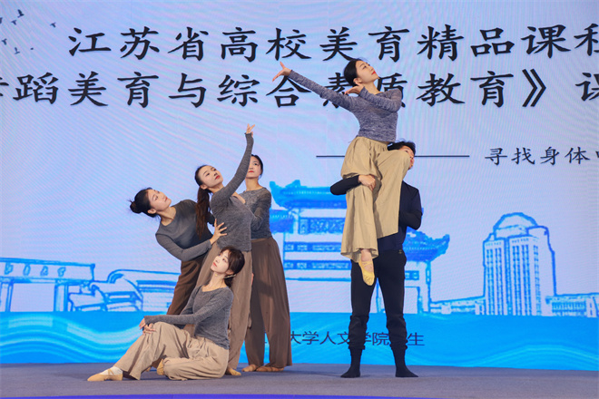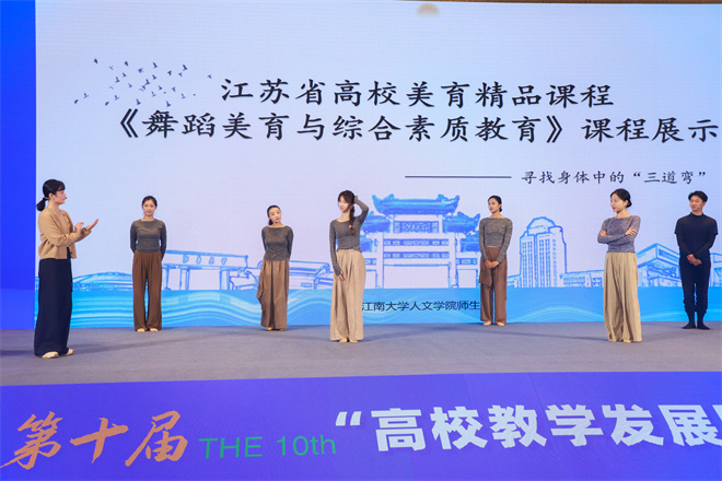 近年来,江南大学各专业主动回应国家教育强国战略,在新文科建设与大美育教育方面积极探索,在做好专业课程建设的同时,用心推动通识教育类课程的开展。10月22日,由江南大学人文学院舞蹈编导专业教师陈妍博士及王希贝、牛喻鑫、刘泽、孙箫誉、潘怡瑶、宋文军等六位同学共同创作的沉浸式教学情景剧《寻找身体中的“三道弯”》,作为江南大学特色课程在2023第十届“高校教学发展网络”(CHED)年会上展示,将江苏省高校美育精品课程《舞蹈美育与综合素质教育》的改革理念带上舞台。