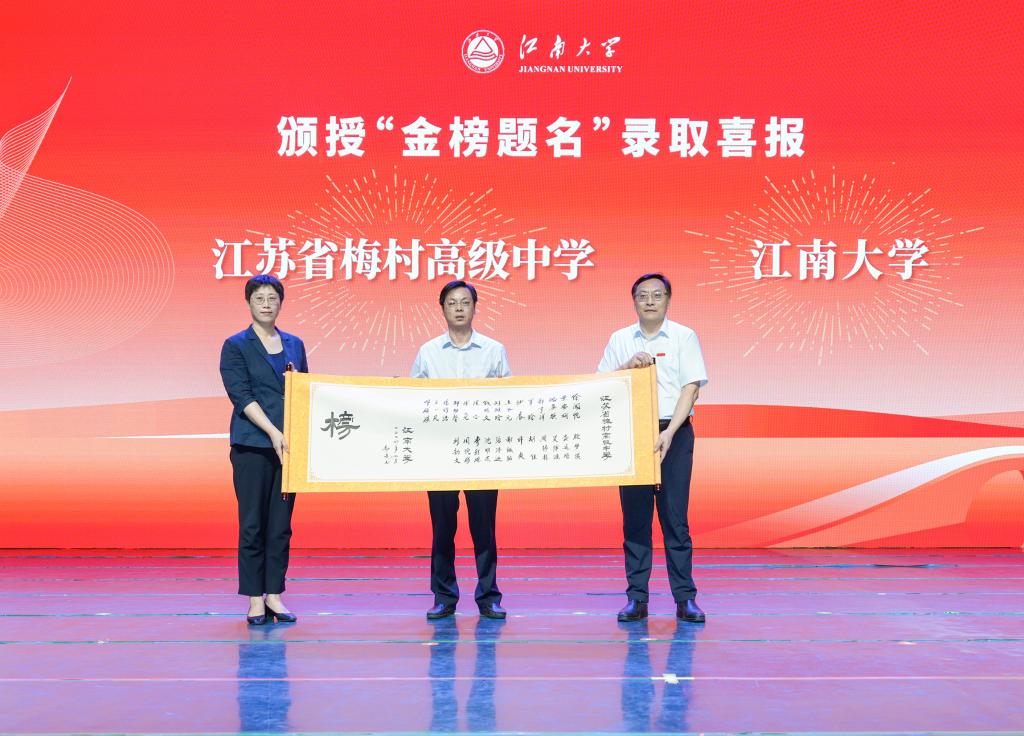 饮水思源,师恩难忘;“双高”联动,协同育人。吴正国为现场家长代表献花,并与校党委宣传部部长李佳敏、本科招生办公室主任李兆丰、食品学院党委书记傅莉莉、生物工程学院党委书记程捷音、设计学院院长魏洁、纺织科学与工程学院党委书记张菁燕、物联网工程学院党委书记张华、商学院党委书记刘长青和无锡医学院副院长程洋共同为优质生源高中校领导赠送“金榜题名”录取喜报,感谢新生家长和优质生源高中为我校培养和输送了一大批品学兼优的学子。