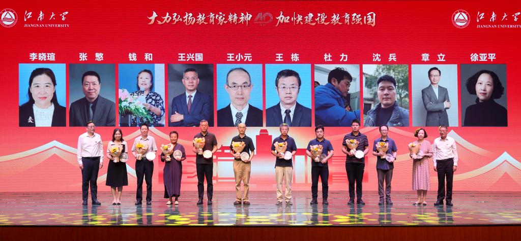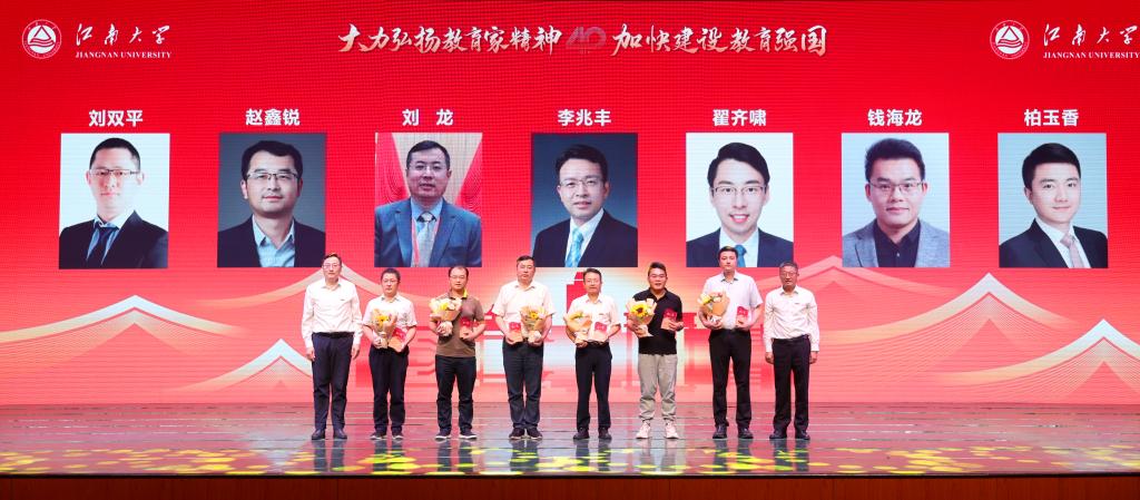 表彰环节,吴正国和陈卫分别为“全国三八红旗手”“江苏省五一巾帼标兵”“江苏青年五四奖章”、 国家重大人才项目、国家科技进步奖、国家杰出青年科学基金、优秀青年科学基金获得者颁发纪念奖牌和鲜花。校领导戴月波、张影陆、堵国成、倪松涛分别为获奖代表颁发纪念奖牌和鲜花,荣获江苏省高校教师教学创新大赛,江南大学至善教学奖、至善优秀教材奖、至善青年教学奖,我最喜爱的老师、江苏省榜样教务员、江苏省辅导员年度人物、江苏省首批辅导员名师工作室获奖代表依次上台领奖。获奖老师们爱岗敬业、严谨治学、自信自强、乐于奉献,是广大教师学习的楷模。