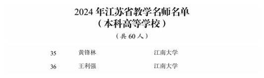 “江苏省教学名师”旨在表彰长期从事教育教学工作、注重教育教学改革、育人成效显著、教学实绩突出的优秀名师。黄锋林、王利强教授教学成果卓越、学术造诣深厚,此次两位教授同时入选,既是个人多年耕耘的成果,也是学校深化教育教学改革、强化师资队伍建设的生动缩影。未来,学校将继续以高水平师资队伍建设为核心,深化教育教学创新,培育更多“大先生”和“引路人”,奋力写好“教育强国,江南何为”的时代答卷。