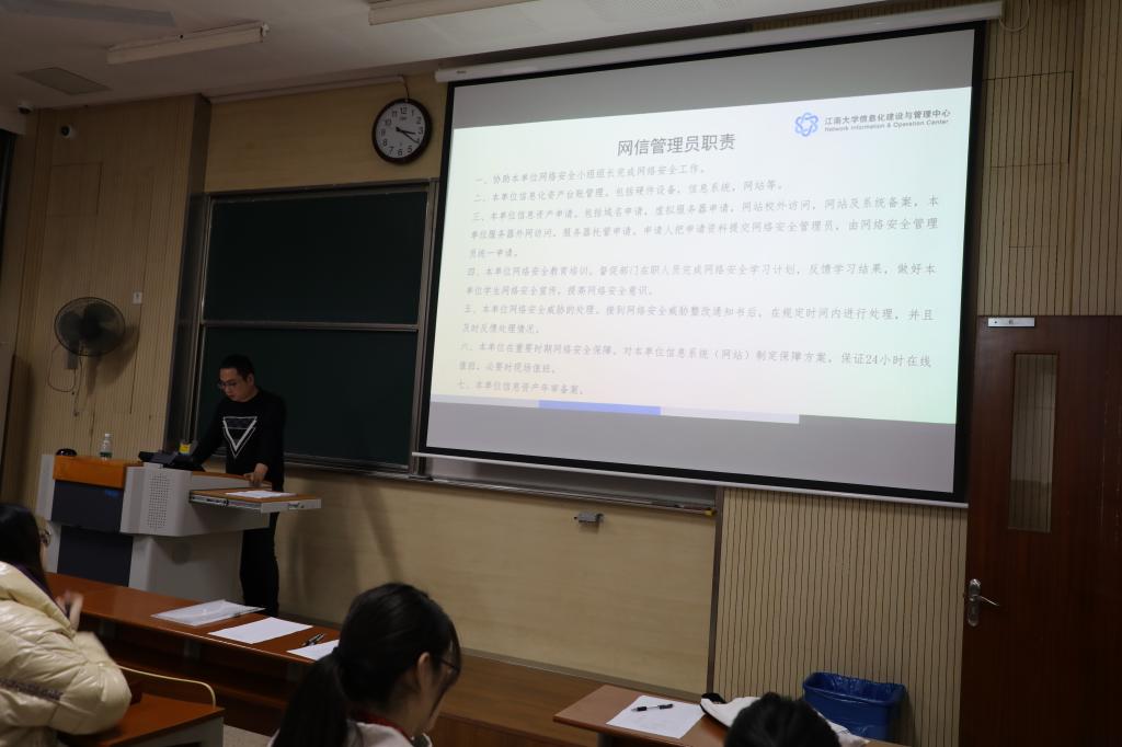 为深入学习贯彻习近平总书记关于网络强国的重要思想,保障江南大学网络信息安全,维护校园网络与信息安全秩序,根据《中华人民共和国网络安全法》、《江南大学信息化建设管理办法》,结合学校实际,学校于11月2日发布了《江南大学网络信息安全管理办法(2020年修订)》,其中,文件要求各部门和学院需设立1-2名网络信息安全管理员负责本单位具体日常网络信息安全工作。为进一步落实各单位网络安全管理员,提高其信息化技能水平,校网络安全与信息化领导小组办公室(信息化建设与管理中心)于12月9日开展了网信安全管理员网络安全业务培训。