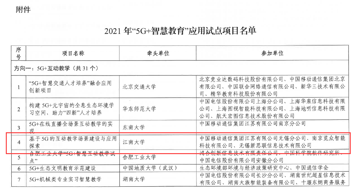 近日,工业和信息化部办公厅、教育部办公厅公布“5G+智慧教育”应用试点项目名单,江南大学组织申报的《基于5G的互动教学场景建设与应用探索》项目获2021年 “5G+互动教学” 试点方向项目立项。