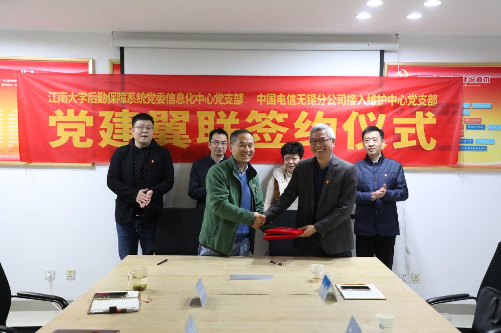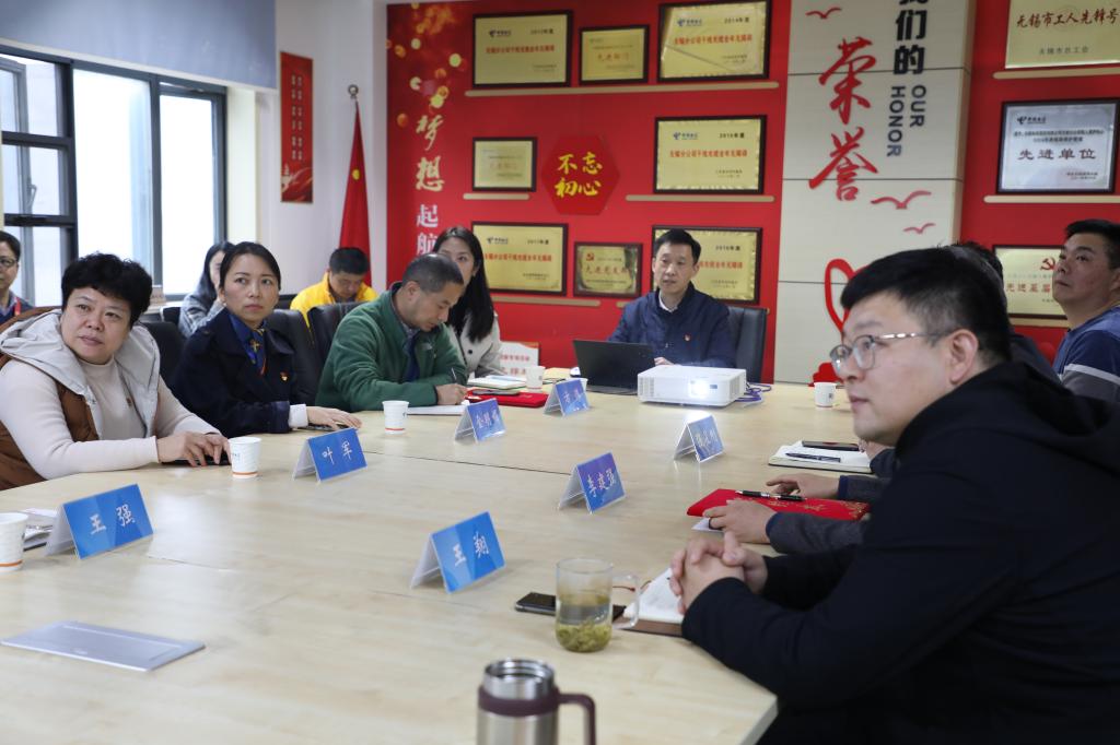 为深入学习贯彻党的二十大精神,落实新时代党的建设总要求,加强基层党组织建设,充分发挥党员引领作用,增进支部学习交流,促进支部共同发展,11月18日下午,信息化中心党支部全体党员走进中国电信无锡分公司梁溪北局,与接入维护中心党支部开展“党建翼联”党建联盟活动。江南大学后勤保障系统党委书记叶军,副书记金明媚,信息化建设与管理中心主任王强,信息化中心党支部书记方伟参加活动,接入维护中心党支部书记李建强主持活动。