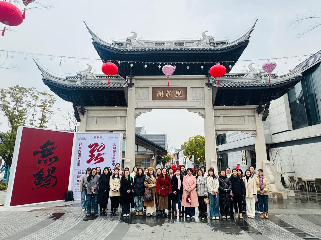 春风和煦,阳光明媚,女教职工们满怀期待地踏上了周新古镇之旅。作为一个具有百年历史的古镇,它始建于1902年,由无锡籍民族实业家、“煤铁大王”周舜卿一手创建,他怀揣造福家乡的愿景,开辟街道、建造市屋、架设桥梁、开设店铺,逐渐将这片土地发展成了繁荣的周新镇。古镇不仅保留了江南水乡特有的临河民居、古朴的桥梁、庄严的祠堂和热闹的戏台等传统建筑,更见证了无锡历史上第一家机械缫丝厂——裕昌丝厂的辉煌。裕昌丝厂的建立,不仅推动了无锡民族工商业的蓬勃发展,更在全国范围内产生了深远的影响。漫步在古镇的青石板路上,女教职工们仿佛穿越时空,感受着古色古香的建筑和码头,聆听着百年工商的繁荣与辉煌。此外,她们还参观了“共和国100个经典民生设计展”,通过一件件展品,深入了解中国近现代工业设计的演变与成就,感受到了民族工商业自强不息、勇于创新的精神风貌。