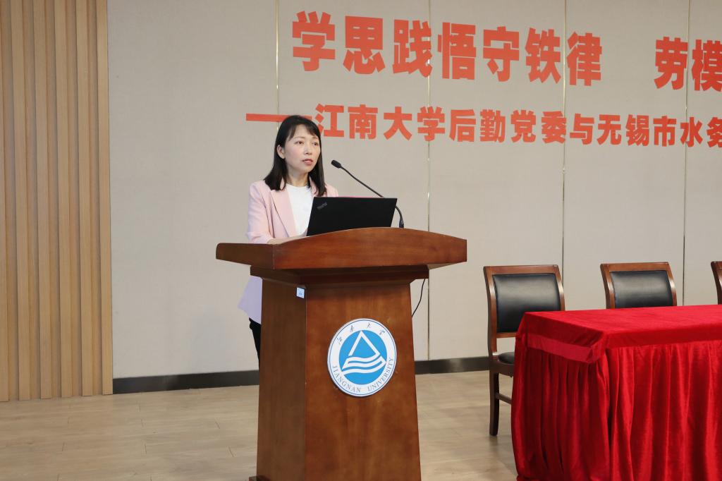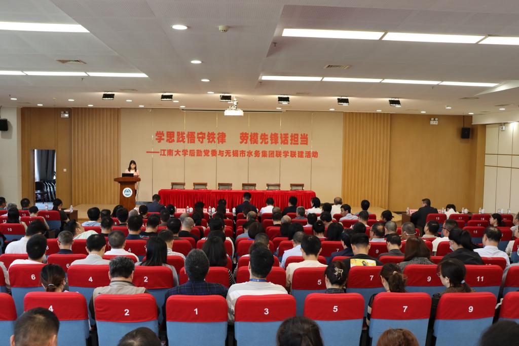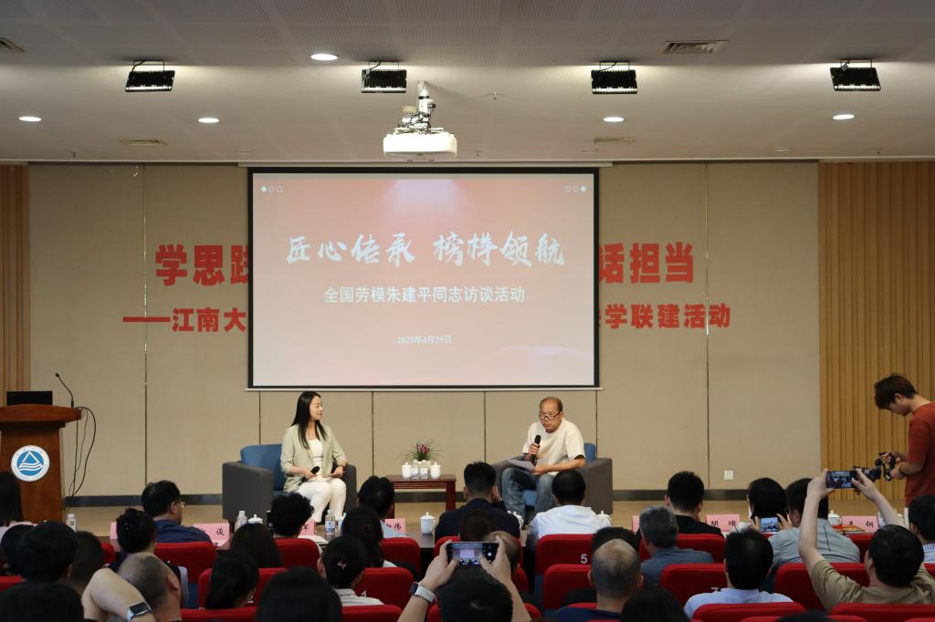 为进一步弘扬劳模精神,发挥榜样作用,在“五一”国际劳动节来临之际,4月29日下午,江南大学后勤党委、后勤分工会在图书馆三楼报告厅开展“匠心传承 榜样领航”全国劳模访谈活动。活动特邀全国劳动模范、全国五一劳动奖章获得者、原无锡市水务集团朱建平同志分享奋斗历程,后勤党委全体党员、后勤管理处五岗及以上人员、后勤技术骨干、一线员工代表、无锡市水务集团共建支部全体党员等近300人参加活动。本次活动由后勤分工会主席金明媚主持。