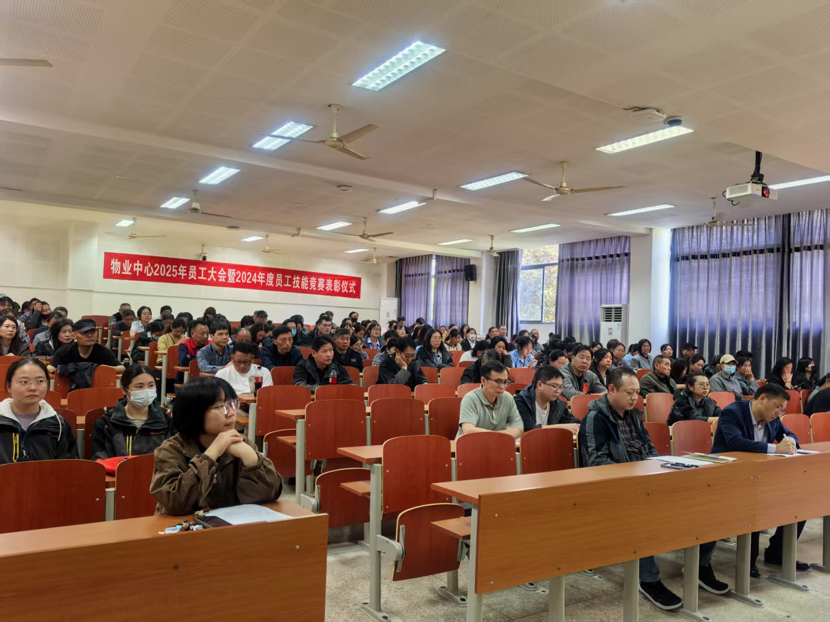 4月15日下午,后勤管理处物业中心在第一教学楼B103召开2025年员工大会暨2024年度员工技能大赛表彰大会。物业中心主任汪洋、常务副主任蒋达锋、保障科科长郝志敏以及物业中心全体员工、物业服务外包单位代表共近200人参加会议。会议由物业中心副主任张亚南主持。