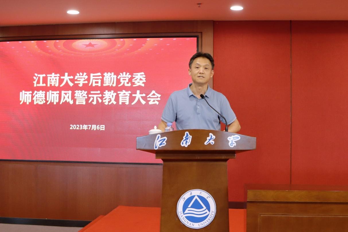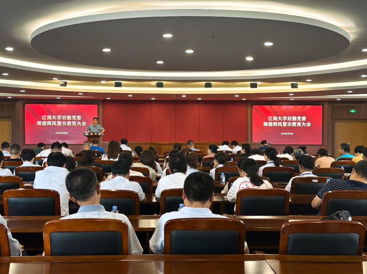 7月6日,江南大学后勤党委师德师风警示教育大会在图书馆A510报告厅举行。后勤党委全体教职工、后勤管理处五岗及以上人员共220余人参加会议。会议由后勤党委书记朱新伟主持。