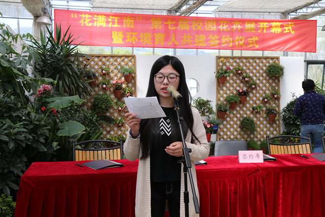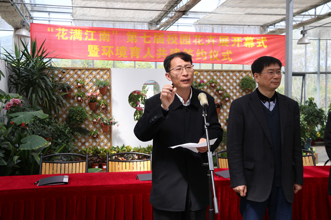 开幕式上,后勤管理处处长方正泉公布了花卉节的主要内容,包括室外花卉展,景观温室花卉展,植物科普展,共建绿化责任区活动和环境育人共建签约活动,同时准备了4000多盆自培绿植花卉赠送每一位教职工;后勤管理处副处长李勤与相关学院签订环境育人共建协议书;外国语学院的史荷敏同学作为学生代表发言;后勤管理处环境中心向参加活动的师生赠送绿植花卉。