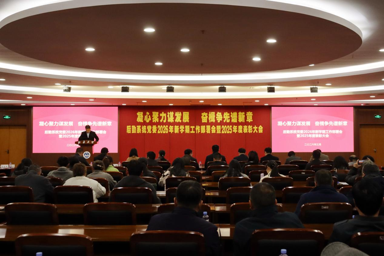 凝心聚力谋发展,奋楫争先谱新篇。3月26日下午,后勤系统党委在图书馆五楼报告厅召开2026年新学期工作部署会暨2025年度表彰大会。校党委常委、副校长戴月波出席会议,后勤系统党委全体科级及以上干部,校医院、基建处全体教职工,后勤管理处五岗及以上人员,社会服务单位负责人及全体获奖人员参加会议。后勤系统党委书记朱新伟主持会议。