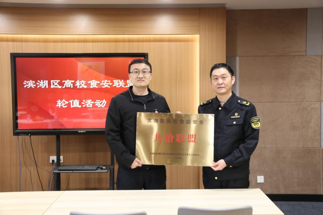 会上,后勤管理处副处长吴江代表江南大学作联盟上一年度轮值工作总结。作为滨湖区高校食安共治联盟首轮轮值单位,江南大学始终锚定校园食品安全底线要求,秉持“以共建推动共享,以共查实现共促”的工作宗旨,牵头搭建联盟协同交流核心平台,先后策划开展“江南‘轻’韵・享‘瘦’食光”健康饮食主题科普、校园食品安全事故应急演练等系列活动,为联盟规范化运行、区域高校食安治理水平整体提升奠定了坚实基础。会议最后举行联盟轮值单位交接授牌仪式,颜炜为新一任轮值单位太湖学院正式授牌,标志着滨湖区高校食安共治联盟的工作接力顺利完成,区域高校食安协同治理工作迈入接续发力新阶段。