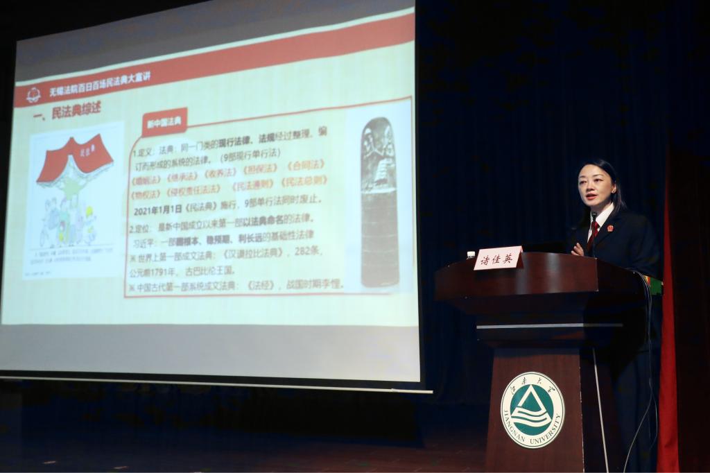 为深入学习宣传习近平总书记关于全面依法治国的重要论述,特别是关于民法典的重要指示精神,深入开展民法典学习宣传活动,增强法治思维,以理论学习的新提升,不断开创后勤保障工作的新局面,10月23日下午,后勤保障系统党委在南区活动中心报告厅举办“连线民法典,感知新时代”职工专题学习报告会,特邀无锡市中级人民法院民法典宣讲团成员诸佳英法官做专题报告。后勤保障系统干部职工近200人参加会议。会议由后勤保障系统党委副书记兼后勤工作协调办公室副主任金明媚主持。