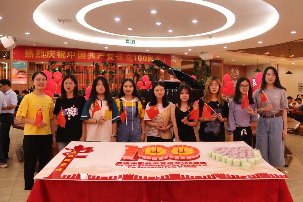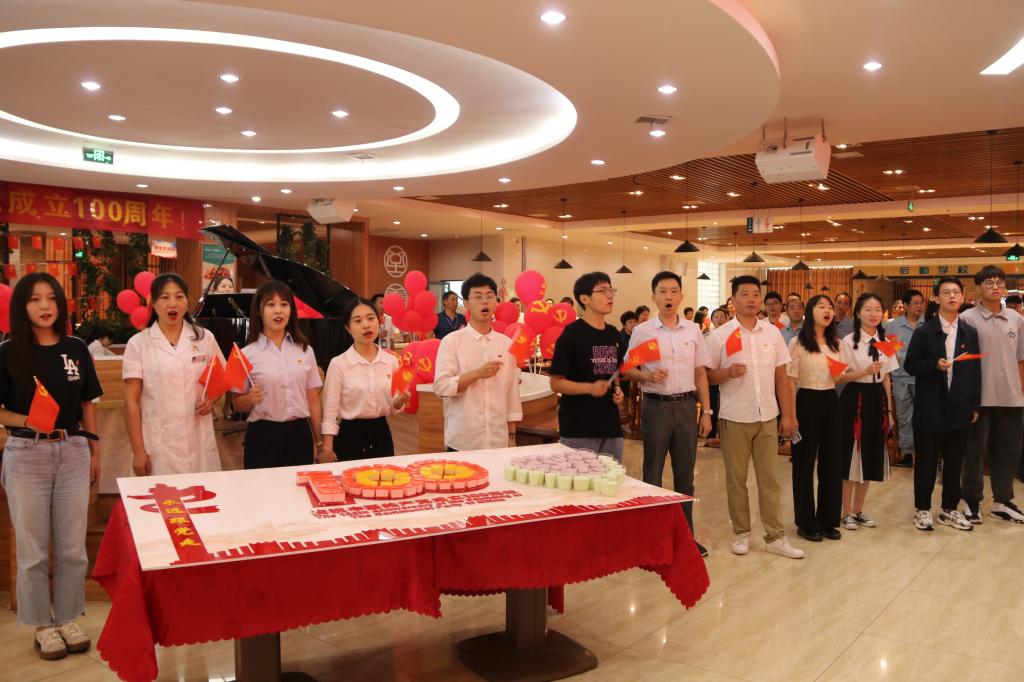 在活动现场,伴随着熟悉的旋律响起,领唱党员的歌声娓娓道来,激昂的歌声、鼓掌声、欢呼声交相辉映,合唱人员和现场师生们挥舞着手中的党旗、国旗,将快闪活动推向高潮。大家精神饱满、激情澎湃,唱出了感党恩、听党话、跟党走的坚定信念和迎接党的百年华诞的喜悦之情,展现了江南师生对党的赤诚之心和热爱生活、积极向上、与时俱进的精神风貌。除了红歌“快闪”,饮食中心党支部在现场提供了庆祝建党100周年蛋糕,分享甜蜜味道,共享喜悦之情。