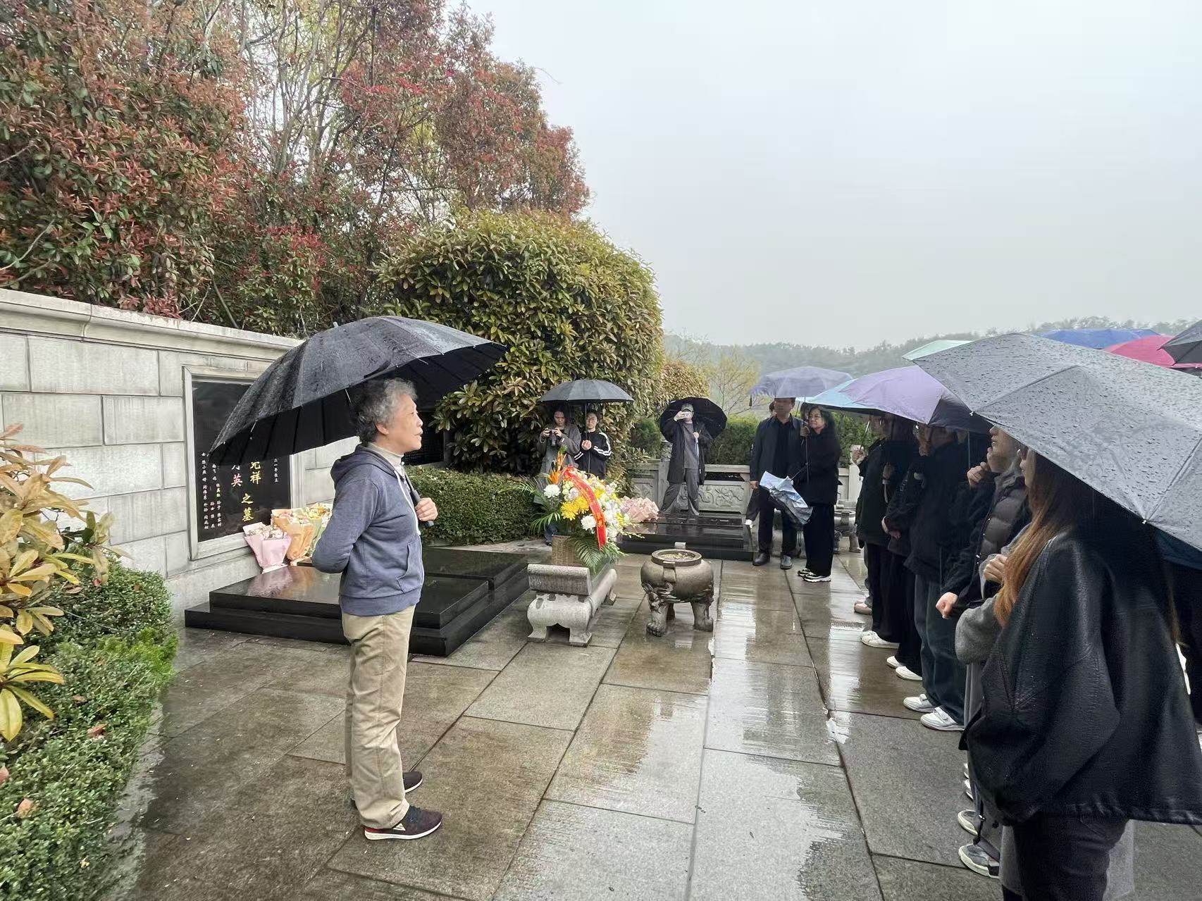 师生绕荣毅仁副主席及夫人杨鉴清墓地鲜花