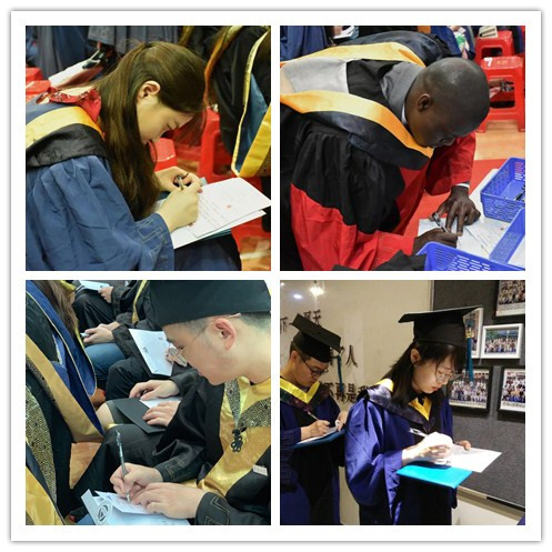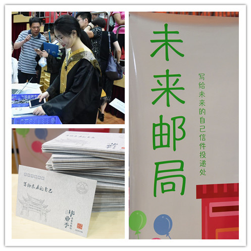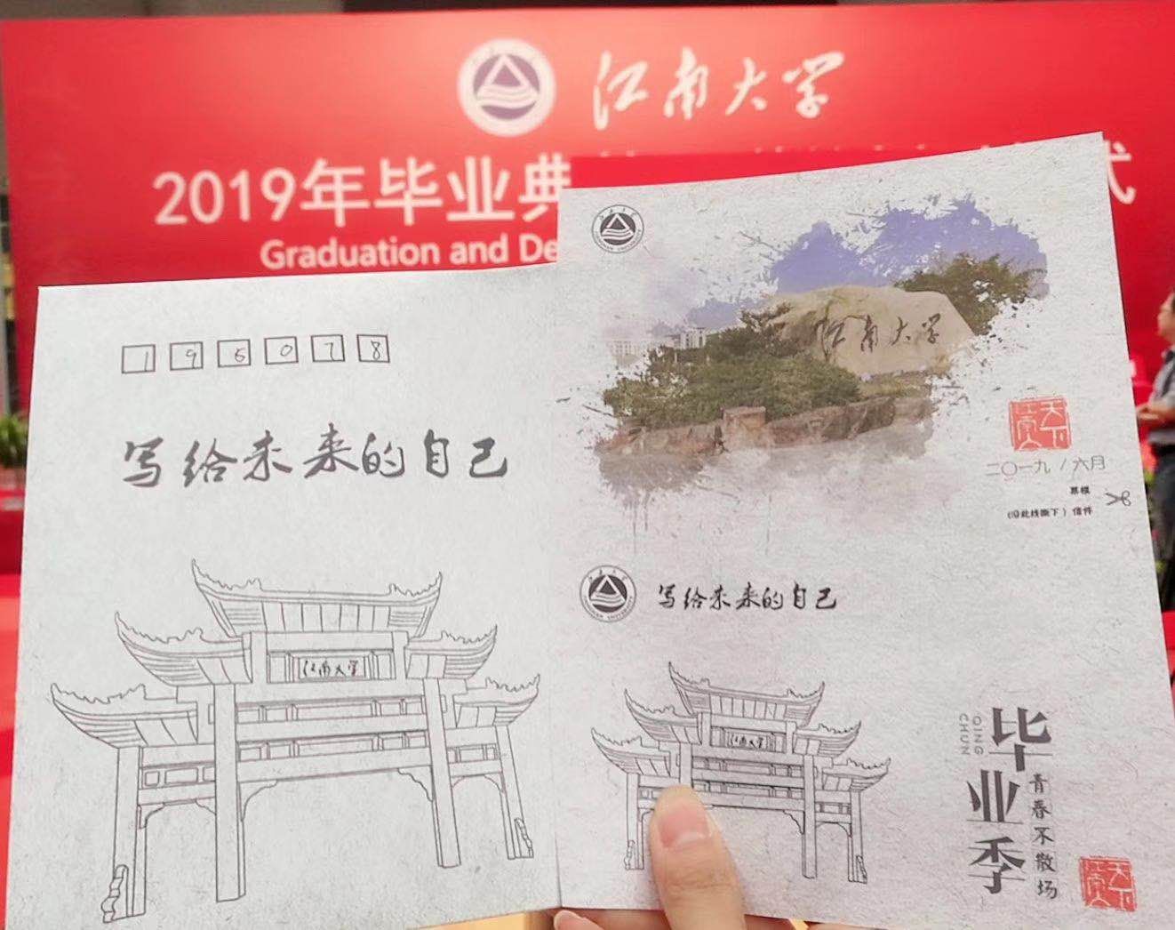 2019年毕业季,江南大学校友会首次在毕业典礼暨学位授予仪式上开展“写给未来的自己”活动。每位毕业生在等待学位授予期间,都拿到了一封特殊来信,这是校友会为2019届毕业生准备的一份神秘礼物。同学们可以在信纸上写下对未来的期许与祝福,由“未来邮局”投递给未来的自己。现场的同学们或沉静思索,或热烈讨论,毕业典礼上陈校长的讲话《守心志无疆》,更是激起了他们对未来的无限向往。