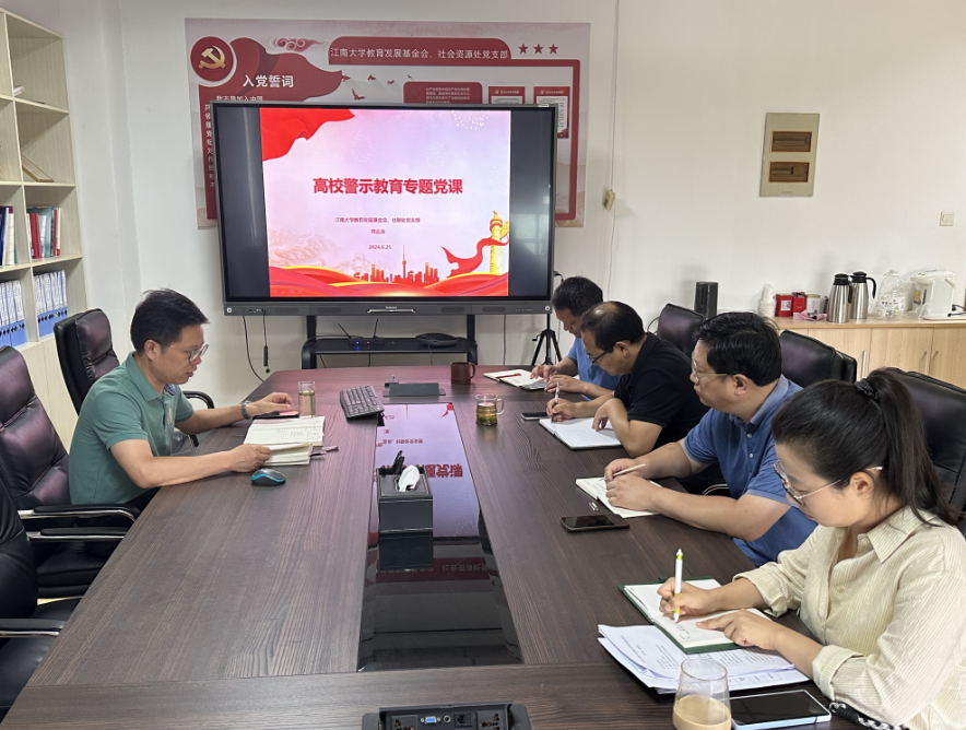 为深入学习贯彻习近平新时代中国特色社会主义思想,贯彻落实党纪学习教育,6月25日上午,教育发展基金会、社会合作与校友联络处党支部在文浩馆301会议室开展专题党课培训。