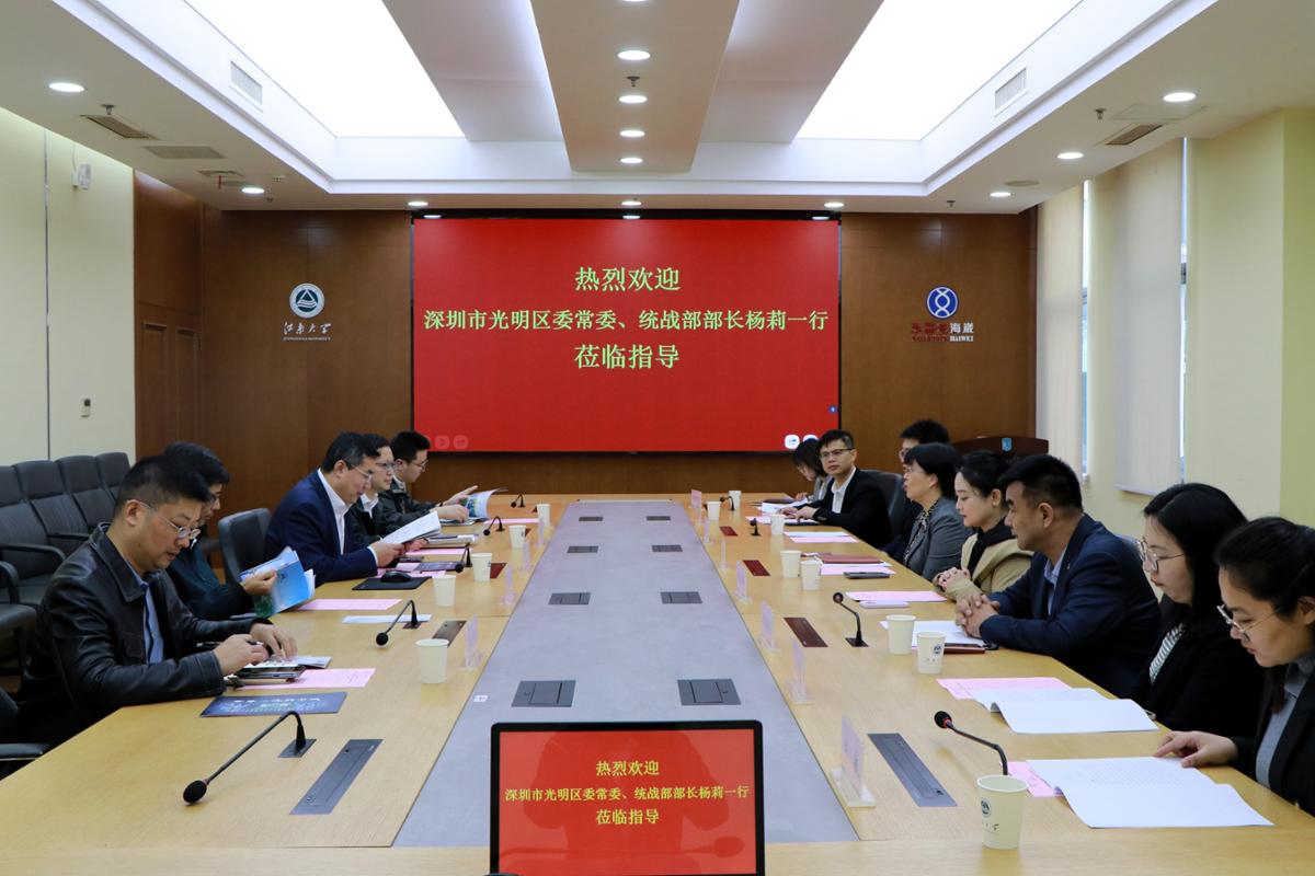 11月12日,深圳市光明区委常委、统战部部长杨莉一行,来校交流推进校地产学研合作。校党委常委、副校长刘龙,产业技术研究院副院长彭新建,生物工程学院教授罗玮、副教授武耀康等参加座谈。