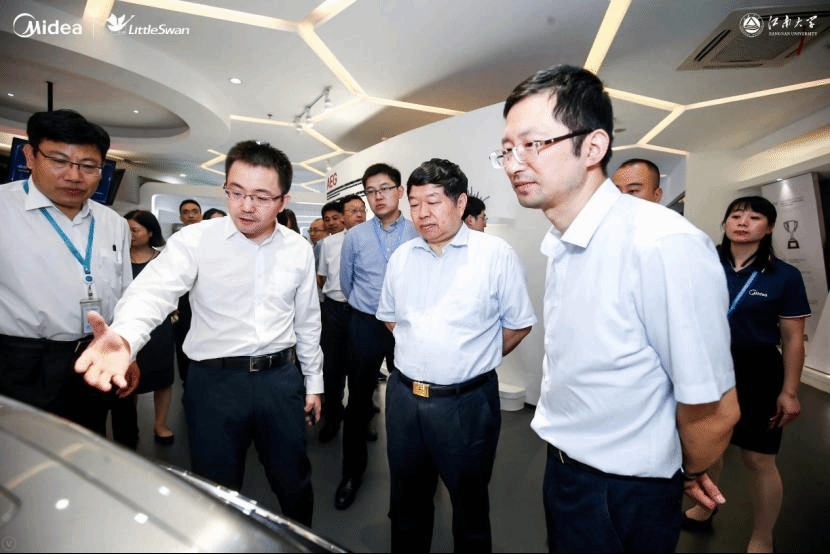 签约仪式开始前,陈坚校长在陆剑峰总裁的陪同下参观了小天鹅洗衣机近年来研发的COLMO等高端智能洗衣机系列新品,并就美的集团与江南大学的合作进行充分的探讨。签约仪式后,项目团队参观了小天鹅研发实验室。