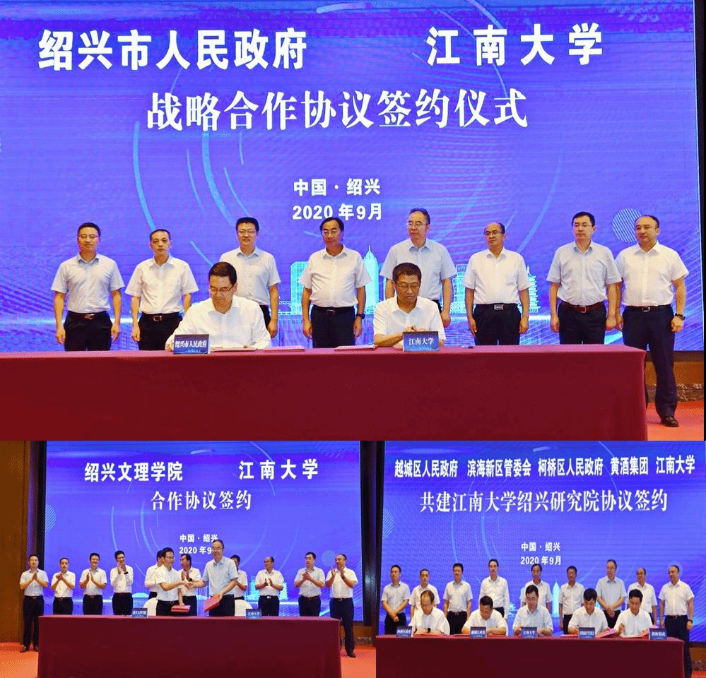 9月15日下午,我校与绍兴市人民政府新一轮战略合作协议签约仪式在绍兴市举行。绍兴市委书记马卫光,市委副书记、市长盛阅春,副市长邵全卯以及市委、市政府相关部门负责人,中国工程院院士、江南大学校长陈卫,校长助理张光生,纺织科学与工程学院教授高卫东,产业技术研究院院长刘龙,传统酿造食品研究中心主任毛健等参加会议。会议由绍兴市副市长邵全卯主持。