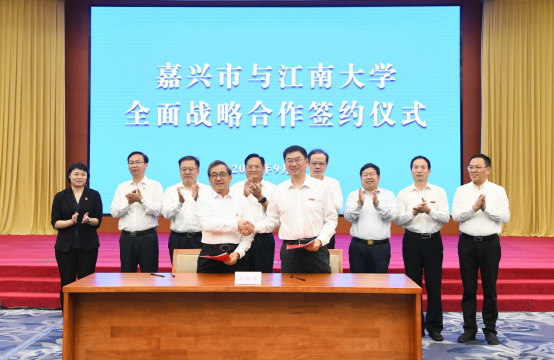 9月24日下午,我校与嘉兴市人民政府全面战略合作签约仪式在嘉兴举行。嘉兴市委书记张兵、市委副书记王涛、副市长盛全生、副市长邢海华、市政协副主席敖考权及相关部门负责人,我校党委书记朱庆葆、中国工程院院士陈坚、副校长田备、校长助理堵国成,党委办公室、产业技术研究院、未来食品科学中心、生物工程学院等单位负责人和教授参加了会议。会议由嘉兴市委副书记王涛主持。