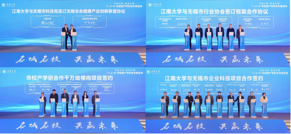 会上,江南大学与无锡市科技局签订无锡生命健康产业创新联盟协议,与无锡市纺织工学协会、无锡市物联网产业协会、无锡机械工程学会签订战略框架合作协议,并与无锡企业签订19项科技合作协议,包括3项千万级产学研合作项目,无锡鼎祺中肃成果转化基金2项拟投项目签约,为新阶段市校合作注入崭新动能、奠定良好基础。