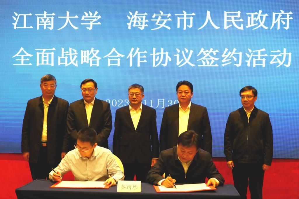 王立与夏卫军签订江南大学——海安市人民政府全面战略合作协议。签约仪式后,与会领导参观了海安市联发纺织、天楹集团、铁锚科技等龙头企业;相关学院负责人及专家教师分别参加了食品加工与智慧农业、高端纺织与时尚锦纶、机械工程和信息技术专场科技对接活动,与现场的120余家企业负责人进行了深入交流,并达成了系列合作意向。