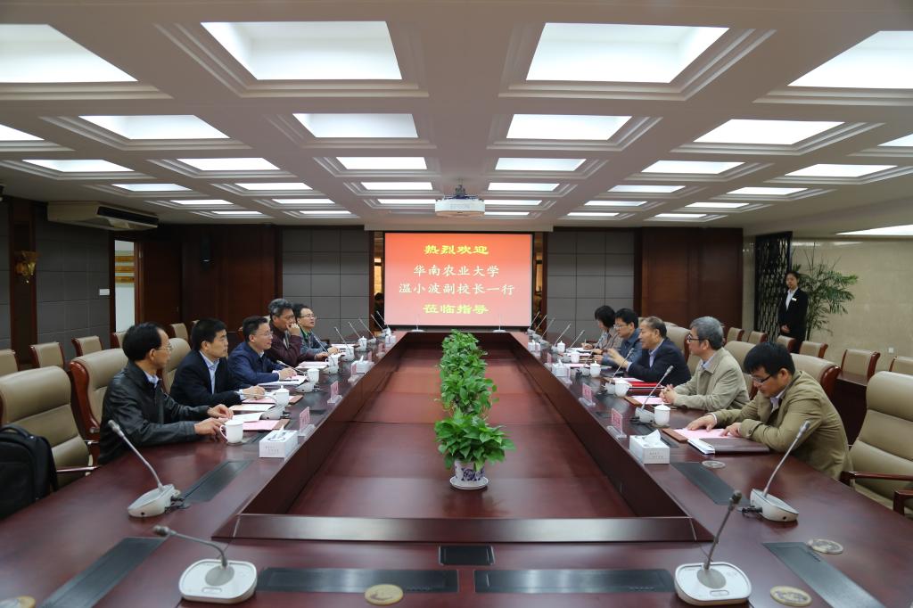 11月13日下午,华南农业大学副校长温小波,党委办公室、发展规划处、科技处、人事处等部门领导来校调研。我校副校长顾正彪,党委办公室、发展规划与重大项目办公室、科学技术研究院、人事处等部门负责人会见了来访宾客并进行了座谈交流。