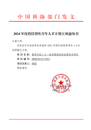 近日,中国科协发布2024年度科技智库青年人才计划评审结果,江南大学发展规划与学科建设处陈栋副研究员申报的《教育科技人才一体统筹推进的政策体系研究》项目成功入选。据悉,此次科技智库青年人才计划,经组织专家形式审查和综合评审等程序,全国共有180人入选,我校入选1人。