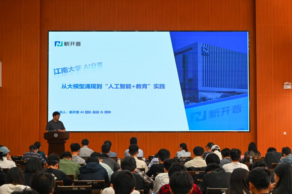 活动之一举办了银龄讲堂,邀请新开普研究院高级AI产品专家赵启、高级算法专家周林共同为物联网工程学院2022、2023年级本科生、硕士研究生、老科协会员与学校信息中心和相关企业的应邀管理和技术人员等计135人,在D328学术报告厅作《从大模型涌现到“人工智能+教育”实践》报告。活动受到现场师生的交口称赞。