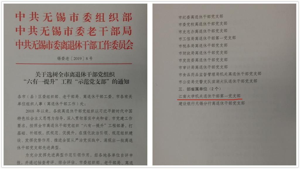 为深入贯彻落实中央和省、市党建工作要求,无锡市委组织部、老干部局、离退休干部工委在全市离退休干部党组织中组织实施“六有一提升”工程,活动中涌现出一批离退休干部党支部先进典型,经各地各单位各党支部自评申报,并通过市有关部门抽查考评、综合评估,共有28个离退休干部党支部被选树为全市离退休干部党组织 “六有一提升”工程“示范党支部”,我校为其中唯一一个学校单位。