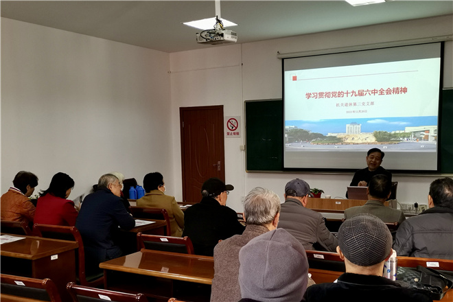 11月26日,机关退休三支部组织党员认真学习了党的十九届六中全会精神,支部书记王剑星同志以“恢宏的史诗 灿烂的华章”为题,重点围绕党的十九届六中全会召开的重大意义和全会公报中的重要论断和历史经验,精心制作了PPT课件,上了学习辅导党课,进行分享解读。