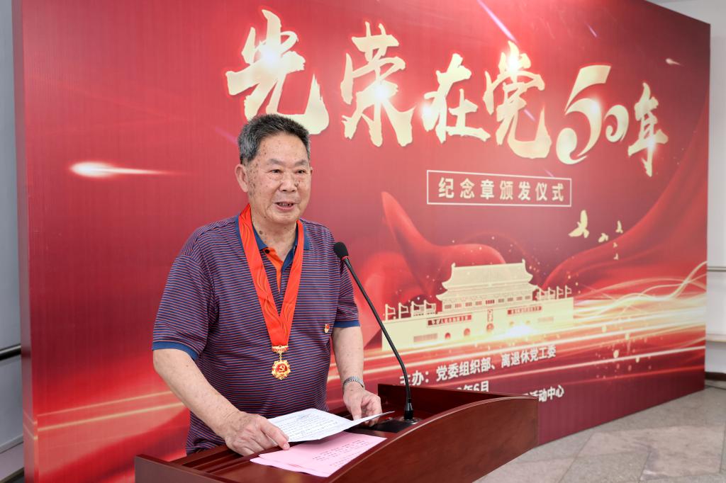 原无锡轻工大学纪委书记厉光裕作为获颁纪念章老党员代表发言。厉光裕深情回顾了自己的入党故事,50年来始终对党抱有感恩之心,坚定地相信党、依靠党、热爱党。他表示,作为一名老党员,思想上不能退休,要始终与党保持一致,用余生为维护党的利益尽其所能。