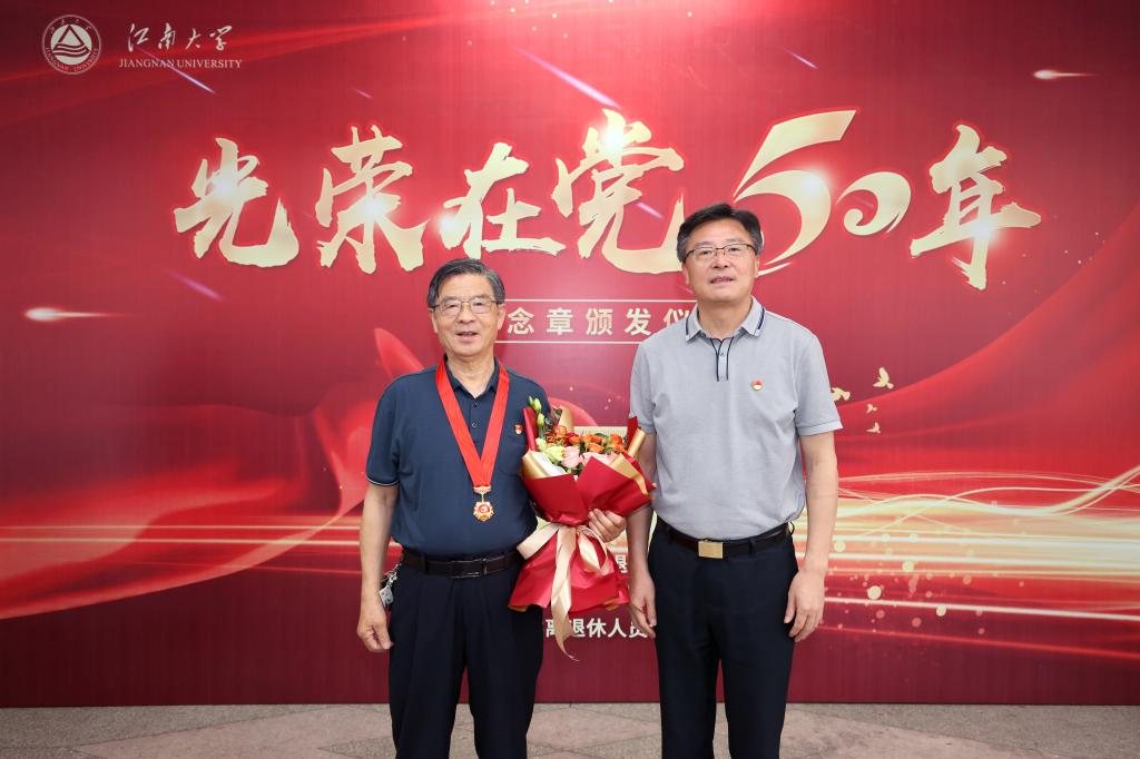 6月29日上午,江南大学2022年“光荣在党50年”纪念章颁发仪式在离退休人员活动中心举行。校党委副书记符惠明、党委组织部常务副部长方正泉、“光荣在党50年”老党员代表、离退休党工委委员、党支部书记代表及学生代表等出席颁发仪式。仪式由离退休党工委书记、离退休工作处处长许群主持。