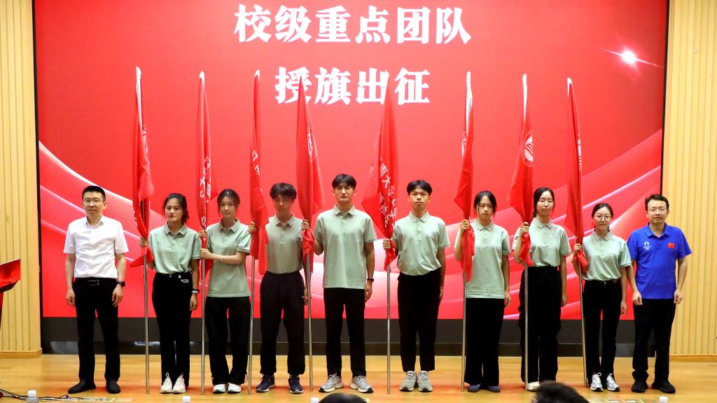 在授旗出征环节,倪松涛为国家级、省级专项团队授旗;黄敏、李兆丰为校级重点项目团队授旗;周云龙、汪超为研究生支教团、西部计划代表、“青年实干家计划”青马专项学员代表授旗。