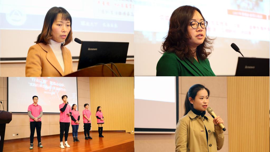 环境与土木工程学院党委副书记金明媚介绍了“大别山扶贫调研”实践团队的实践成果,并从组织、培育和总结三个方面介绍了学院在社会实践组织工作方面的经验做法;食品学院副院长谢云飞介绍了“一带一路,以梦为马”实践团的实践经历与成果,并就国际交流与社会实践在育人工作当中的作用作了思考与分享;数字媒体学院“行走江南,禁毒小分队”与朱凌警官一起分享了实践成果,宣传了禁毒知识;人文学院推普脱贫支教团队、法学院红粉笔支教团的代表也用新颖的形式和富有感染力的演说分别分享了他们社会实践的过程和心得。