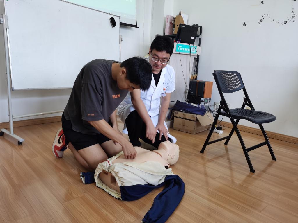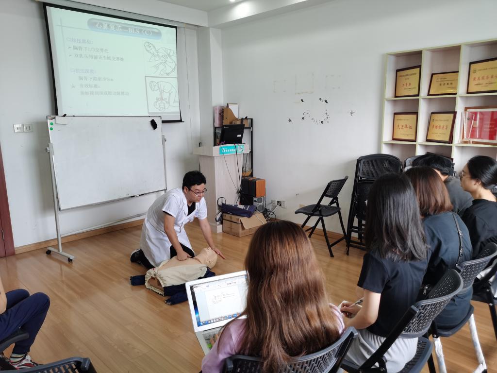 本次培训由校医院杨文军老师主讲,重点介绍了心脏骤停的临床表现与诊断,以及如何有效把握心脏骤停后的黄金四分钟,提高患者的生存率。培训过程中,杨文军指导学员进行心脏复苏的实操练习,以及自动体外除颤器(AED)在心肺复苏中的使用方法,通过专业生动的讲解以及耐心细致的现场指导,研究生支教团成员对心脏复苏急救等技能有了更加科学的认识。除此之外,研究生支教团还学习了利用海姆立克急救法进行自救和如何帮助被食物噎住的患者,以及出现中暑、烧烫伤、出血、动物咬伤、食物中毒、扭伤等意外情况的科学处理方法。