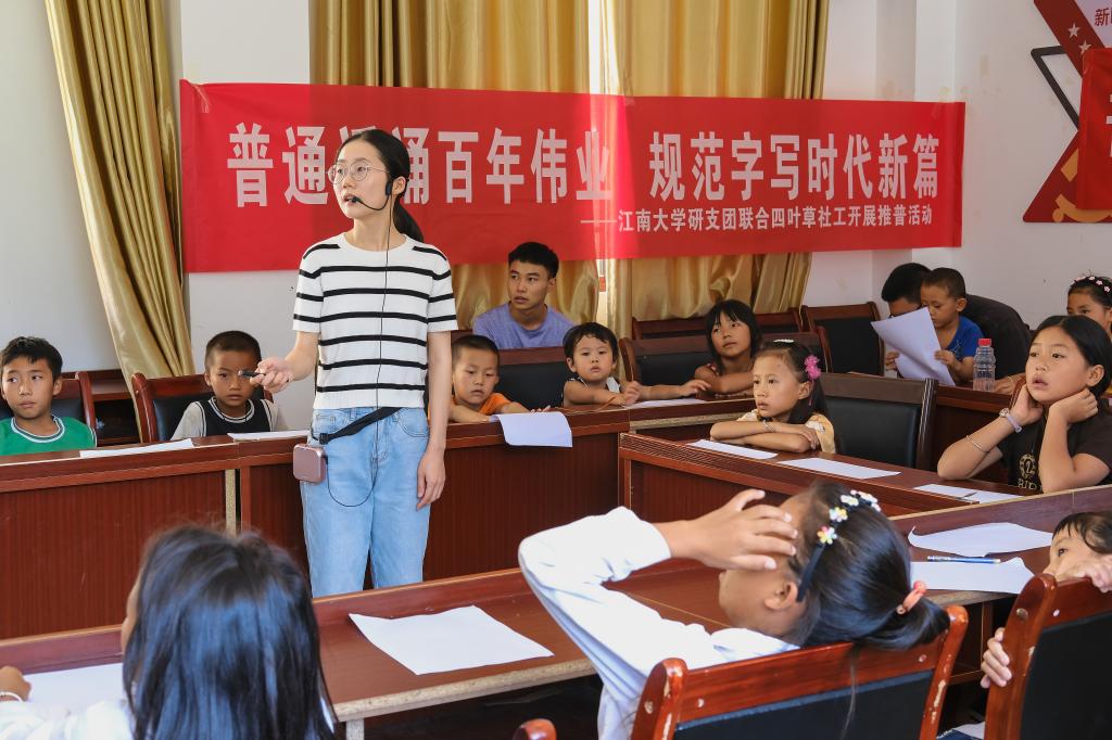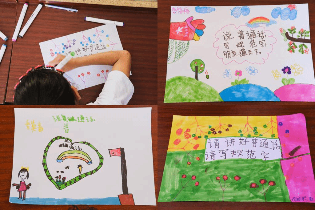 在少数民族聚集区,研支团成员们从小故事大道理、说普通话写规范字、诵经典学汉字、书标语绘理想等四个方面开展活动。研支团成员们通过给孩子们讲述发生在身边的故事,带领孩子学习诵读《三字经》、余光中的《乡愁》以及趣味绕口令等,激发孩子们学习普通话的积极性和主动性。孩子们也通过普通话海报的绘制,表达着他们对讲普通话写规范字的认可,其中一个孩子用不太流利的普通话讲道:“我回去也要教阿奶说普通话。”