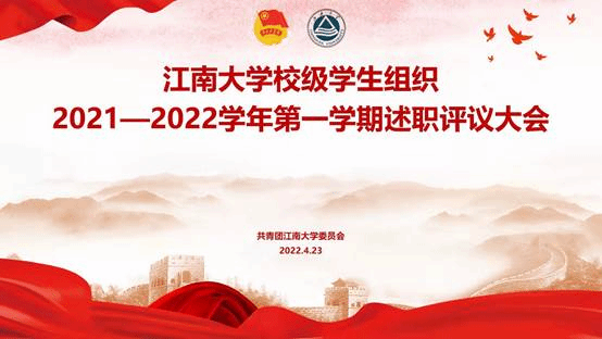 为深入贯彻落实学校《关于深化江南大学学生会(研究生会)改革的意见》,推动我校学生组织常态化管理落实落细,4月23日上午我校举行2021-2022学年第一学期校级学生组织线上述职评议会。校团委、学生工作部(处)、研工部相关老师以及学生组织代表、各学院同学代表出席会议并担任评委。