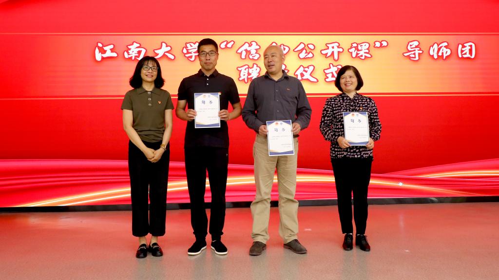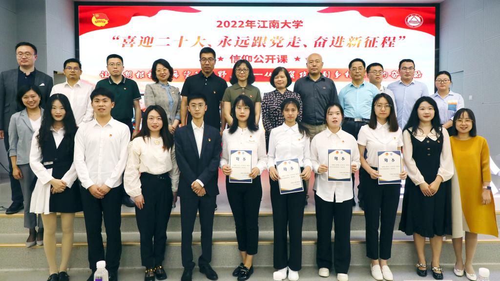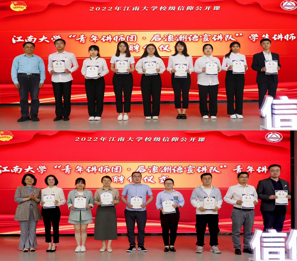 最后,活动紧扣喜迎二十大主题,结合庆祝建团百年,启动了江南大学青年讲师团和“后浪潮语”宣讲队宣讲的序幕,张影陆为戴建明、盖中辉、谢玉梅颁发“信仰公开课”导师聘书,徐锡清、王冰分别为韩宇瑄等8位青年教师、王谡阳等8位青年学子颁发了青年讲师团聘书和“后浪潮语宣讲队”聘书。