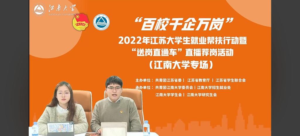 为进一步做好我校2023届应届毕业生稳就业、保就业工作,落实促进大学生就业及帮扶行动要求,保障毕业生顺利就业,12月17日,“百校千企万岗”2022年江苏大学生就业帮扶行动暨“送岗直通车”直播荐岗——江南大学冬季专场直播活动,在江南大学融媒体中心成功举办,本次活动由共青团江苏省委、江苏省教育厅、江苏省学生联合会主办,由江南大学团委、江南大学招生就业处、江南大学学生会、江南大学研究生会共同承办,活动通过线上直播、募集推送岗位以及就业精准帮扶等形式开展,并覆盖我校全体毕业生。