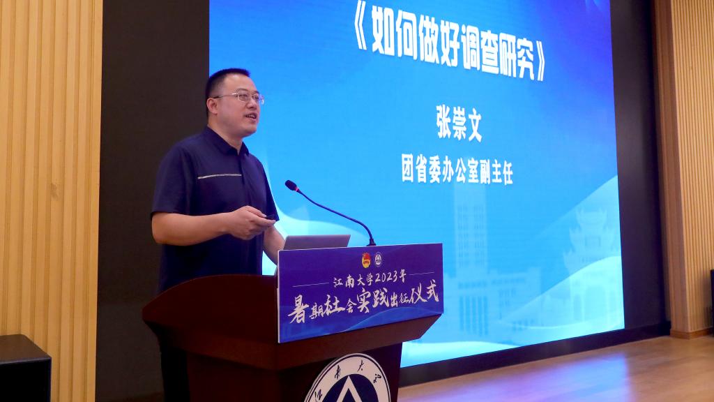 出征仪式结束后,团省委办公室副主任张崇文以《开创圈外的生命 寻找远方的自己》为题,就如何在社会实践中做好调查研究为师生上了实践第一课。