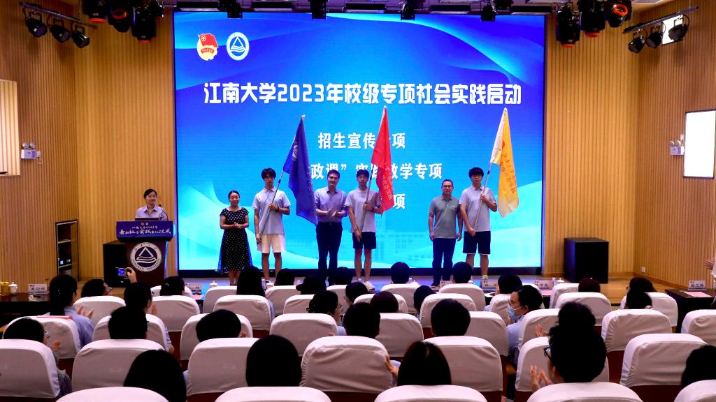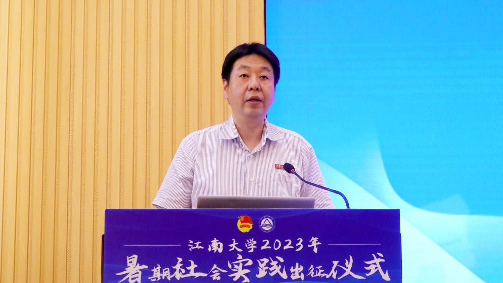 倪松涛向江南大学“强国有我,青春有为”2023年暑期社会实践团代表授旗,并作动员讲话。他围绕深学细悟笃行习近平新时代中国特色社会主义思想,强调了社会实践的重要意义,并向参与实践的同学们提出三点希望:一是以实践为本,用好调查研究这个“传家宝”;二是以实践为师,涵养“自讨苦吃”的精气神;三是以实践为舟,做好服务人民的大文章。