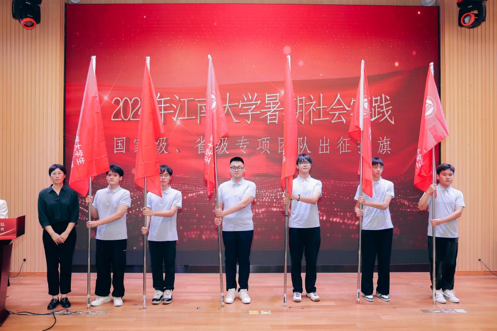 周伟涛、黄敏为我校2023年暑期社会实践先进单位颁奖。魏珍吉部署2024年江南大学暑期社会实践工作。团委副书记单云婷发布2024年暑期社会实践重点项目团队。李佳敏、李兆丰为2024年江南暑期社会实践团代表授旗。王维为我校2024年研究生支教团、大学生志愿服务西部计划、江苏大学生志愿服务乡村振兴计划入选志愿者代表授旗。