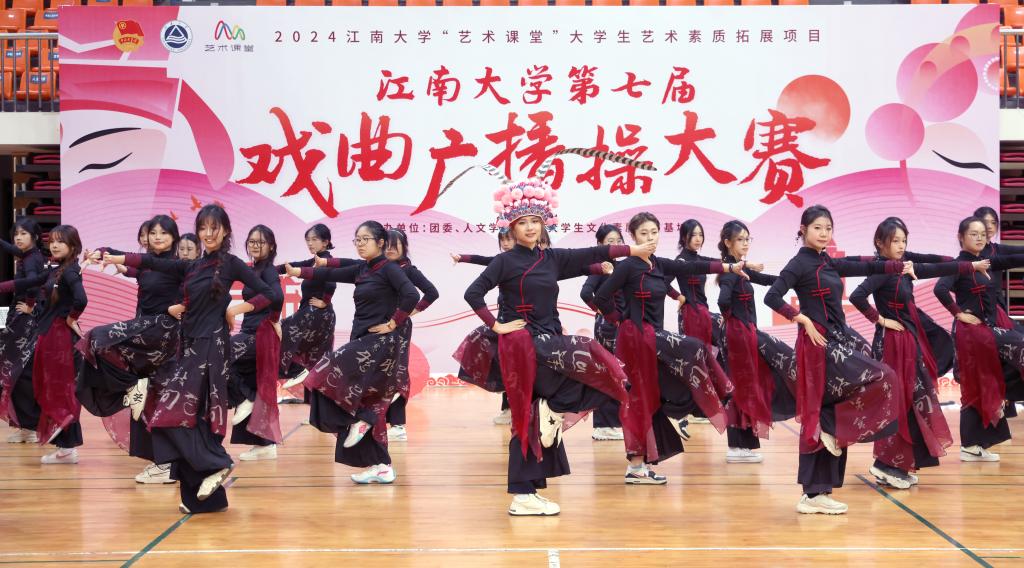 比赛中,参赛学院的创意编排和表演精彩纷呈,带来了一场美轮美奂的中华传统文化盛宴。外国语学院的表演伴着悠扬婉转的古筝展开,白衣蓝纱、粉黛长袖随动作摆动,表现了江南的柔美与雅致;设计学院身着黑纱马面裙,头戴京剧头饰,穿插舞剑、长扇、江山图等元素,将穆桂英挂帅的戏剧选段巧妙地融入戏曲广播之中,展现了气宇轩昂的江南风采;商学院融入戏剧唱腔、长笛、武术等传统文化符号,并融合了羌族、维吾尔族、藏族等多民族文化,诠释了中华民族一家亲的文化内涵;医学院巧妙地将心肺复苏的急救动作编入戏曲广播操,展现了健体与救护相融合的专业特色,尽显医学人的责任担当;食品学院在表演中加入京剧选段《花木兰》,展现江南人铿锵昂扬的精神气质。人文学院舞蹈编导专业的同学们将戏曲广播操的动作舞蹈化,既保留了戏曲的韵味,也跳出了广播操的时尚,他们动作精细与音乐韵调完美契合,为现场观众带来了一段高水平的演绎。数字技术与创意设计学院在表演中加入了京剧《卖水》选段和剑术表演,集成电路学院将舞狮融入表演中,创意编排与戏曲广播操相得益彰。