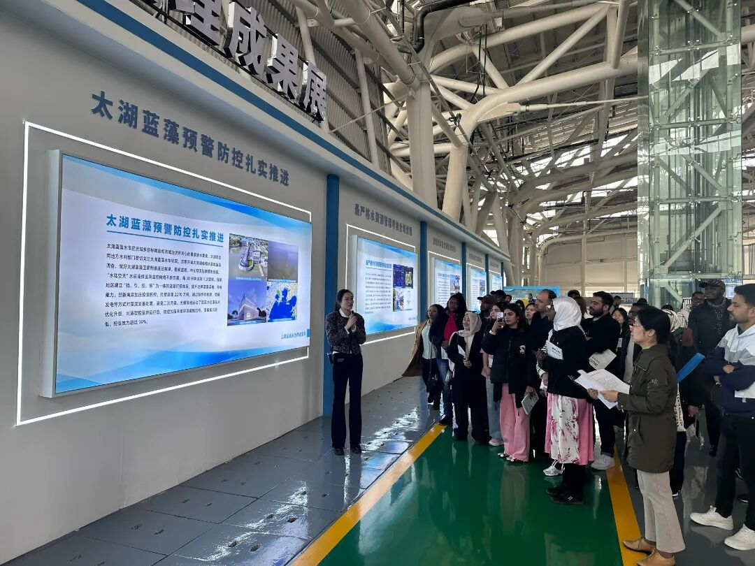 活动首站,留学生们来到水利部太湖流域水治理重点实验室——河湖治理研究基地。在总面积27243平方米的太湖试验厅内,世界首个大尺度室内浅水湖泊风生流物理模型——太湖全湖区风生流物理模型令大家驻足惊叹。该模型模拟范围覆盖全太湖湖区、23条主要出入湖河流及49个岛屿,填补了国内外大型浅水湖泊风生流物理模拟的研究空白。通过双语科普讲座《太湖蓝藻知多少》,留学生们深入了解了数字孪生太湖、蓝藻监测预警等前沿技术,直观感受到中国在浅水湖泊水环境治理领域的科技突破。