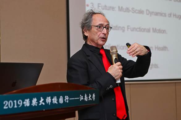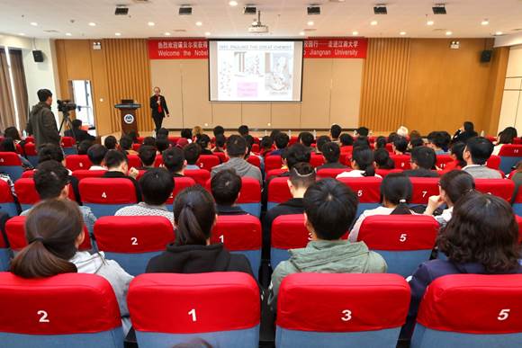 下午,“与大师对话——诺贝尔奖获得者中国校园行之走进江南大学”学术报告会在图书馆三楼报告厅拉开了帷幕,报告会由国际交流合作处江波处长主持。来自全校各个专业不同年级的近500名学生和青年教师来到现场聆听大师的报告,全场座无虚席。在热烈的掌声中Michael Levitt博士开始了“A Wonderful Life in Science”的主题演讲,他告诉同学们要善于发现问题,敢于失败,在不断的失败中寻找突破,他结合自己的人生经历告诉同学们,每个人都是独一无二的,要一直带着坚持的态度去寻找科学的真谛。讲座尾声之际,Michael Levitt博士和同学们进行了亲切交流与互动。他耐心细致地回答了同学们提出的问题,并和大家探讨了有关生物、医药等方面的专业知识;他从自身的经历出发,解答了同学们现阶段所遇到的一些困惑,让大家受益匪浅。