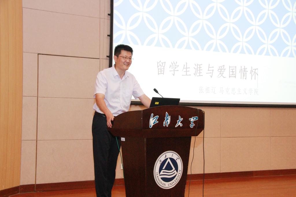 张祖辽以“留学生涯与爱国情怀”为题,结合归国前辈们海外留学后归国报国的实例,指出留学报国是中国留学生的优秀传统。他认为,海外学习经历是一次跨文化学习的历程,能增强对中国文化的理解和认同,能更深入地理解中西文明互鉴。