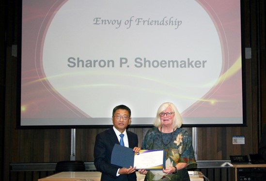 为Sharon Shoemaker教授颁发“江南大学国际友好使者”证书