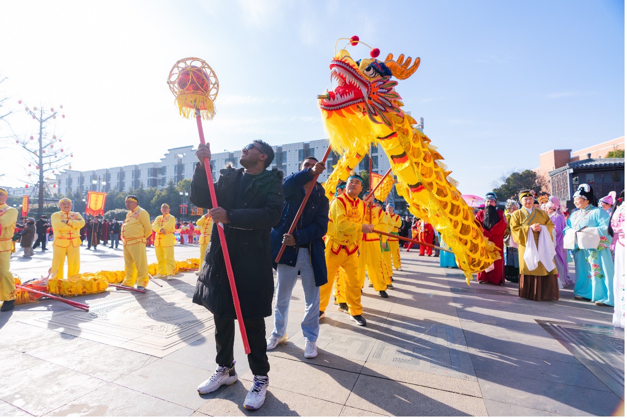 蛇年春节是申遗成功后的首个春节,节日期间学校与无锡市有关部门合作,两次组织留学生沉浸式感受“非遗版”春节的独特魅力。穿汉服、学锡剧、看杂技、打年糕、拓印红包……农历正月初一,锡剧非遗传承人薛燕带领留学生们体验了锡剧的装扮和表演,跟着传统手艺人制作正宗的无锡传统年糕,还参与手工拓印,定制专属自己的新春红包,充分感受中国春节的年俗和风情。农历正月初九,“水韵江苏·非遗陪你过大年”系列活动——无锡梅村“泰伯庙会”民俗巡游热闹开场。我校智利籍留学生BARBARA ANDREA、巴基斯坦籍留学生FARMAN ALI、埃及籍留学生KHALED AHMED 获聘吴文华全球推广使者。随后,留学生们亲身体验了举旗幡牌匾、舞龙舞狮、腰鼓、挑花篮、抖空竹等民俗巡游活动,一起“轧闹猛”、品“非遗年味”。